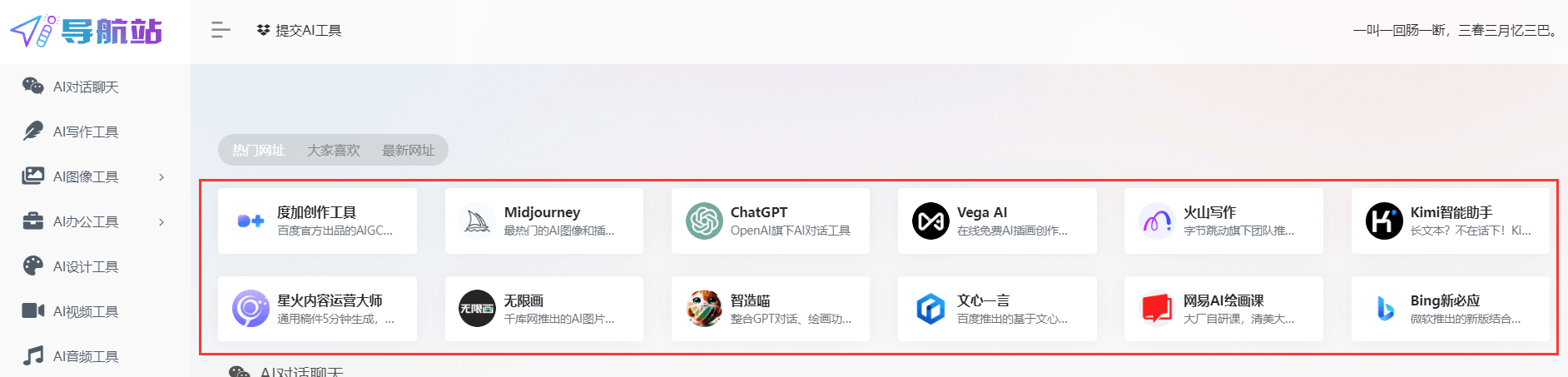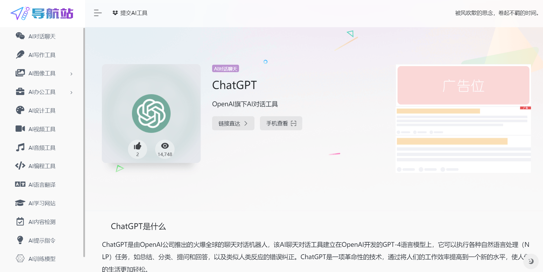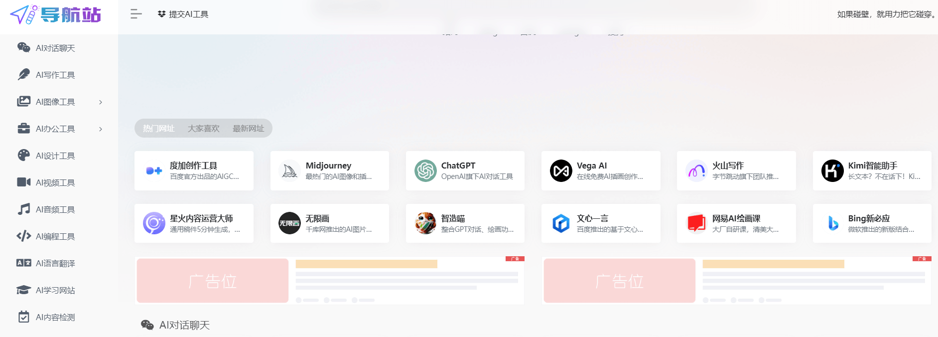 找AI工具,就到AI导航站。AI导航站是一个集国内外优秀AI人工智能工具的导航网站,为用户收集分享AI工具,一起加入人工智能浪潮,助力生产效率提升!为覆盖网站服务器和日常运营开销,本站开放以下广告位投放,欢迎各位在我站投放广告,让更多的用户发现好用的产品。